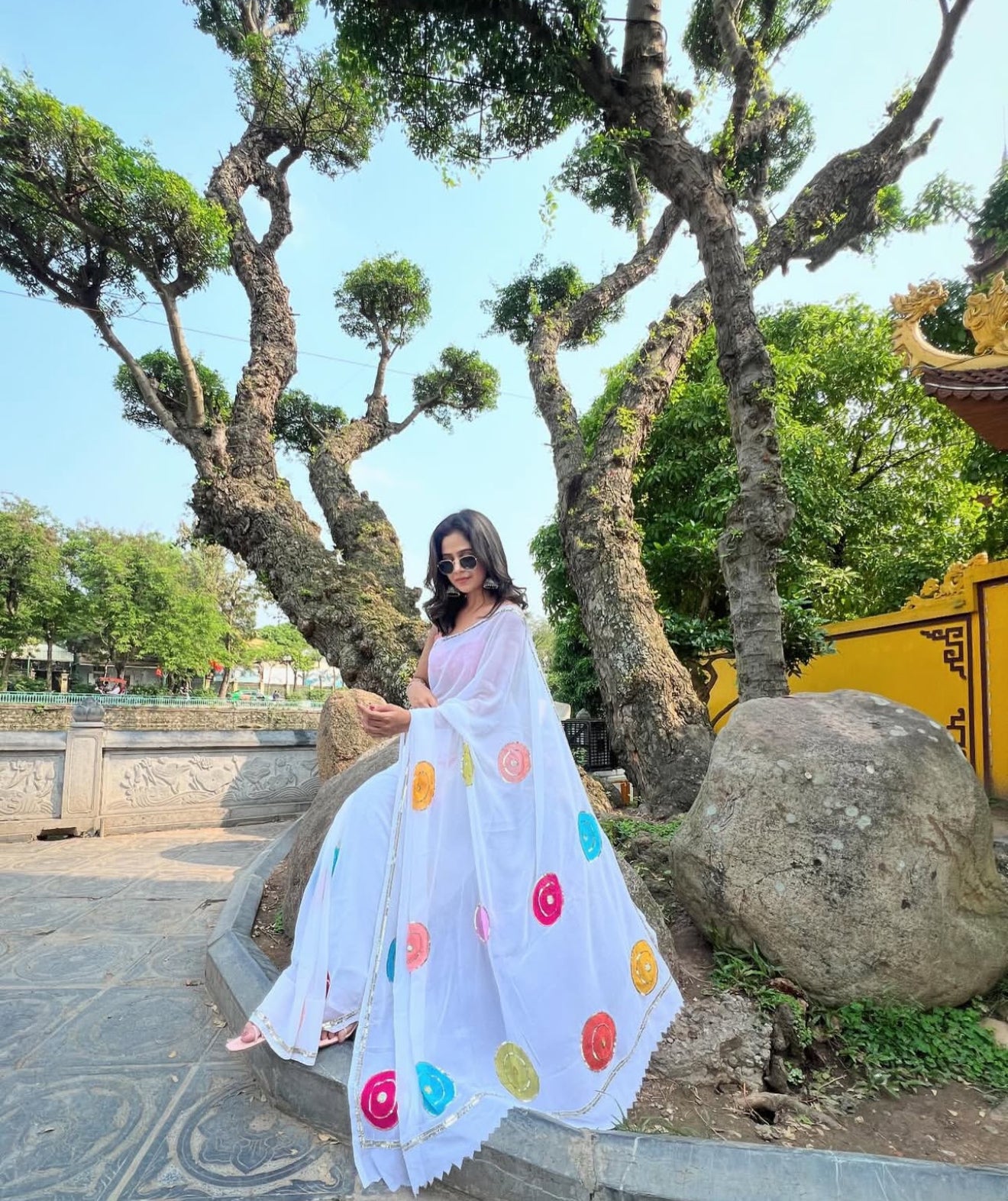 white chiffon saree with sequence,cut daana and stone work